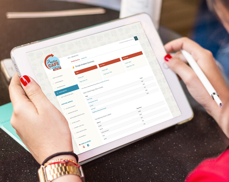Practice Cafe's digital marketing clients want and deserve performance transparency. Our digital marketing client dashboard gives you that transparency! When you become a digital marketing client, you receive your own login credentials to a dashboard that includes sortable visual representations of real-time data relevant to your mix of services. Want to know which keywords you're currently ranking for? How many people are visiting your website? Which Ad copy is generating the most clicks? Want to know how any of those metrics compare to last quarter? Just hop into your dashboard! Your digital marketing team at Practice Cafe will also use this data to inform strategy for your campaigns on an ongoing basis.